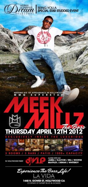 >> MAYBACH MUSIC GROUP – one of the Hip Hop industries leading record labels founded by Rick Ross – their newest signed member and one of the rising artist in todays Hip Hop world – ***** MEEK MILLZ ***** will be LIVE and Direct making his 1st appearance in Hollywood – coming straight from Philadelphia and will be performing all of his hits that have become critical and commercial successes! ::Im a Boss:: ::House Party:: ::TupacsBack:: ::BagOfMoney::