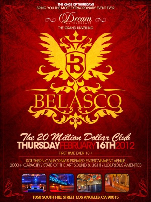 >> The BELASCO Theater is a brand new entertainment venue in the Southern California nightlife scene! Formely a a Theater who hosted legendary acts in the early ’20s and 30’s – it has now been completely renovated with $20 Million Dollars and converted into the newest, biggest and hottest nightclub in all of of SoCal. It features 2000+ capacity, award winning state of the art function1 sound and light system, 4 distinct rooms, 3 patio areas and a massive dance floor! It is truly majestic! Since its debut – it has already courted such luminaries as the Royal Couple Prince William & Kate, Superstar House DJs Deadmau5 & Skrillex and Reggaeton Singers Plan B. This is not just any club – this is a Concert Theatre.