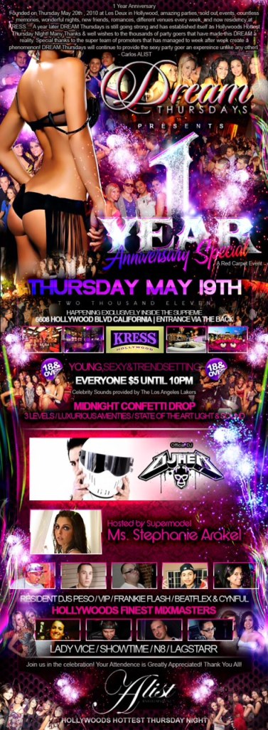 ……: DREAM Thursdays is Hollywoods Hottest Thursday dedicated to the upscale college crowd! Since its incepetion, nearly 600+ and now over 900+ at its residency inside KRESS makes it the absolute weekly party destination! It has achieved the status of “The KINGS of Thursday nights” due to the highly sophisticated crowd that it brings, and the enviornment in which its held. The fun & excitement never ends!!