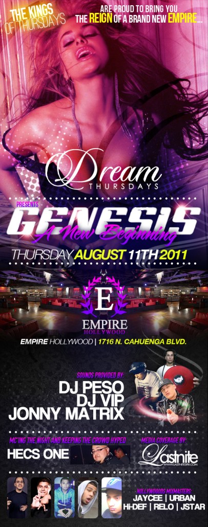 ……: DREAM Thursdays is Hollywoods Hottest Thursday dedicated to the upscale college crowd! Since its incepetion, nearly 600+ and now over 900+ at its residency inside KRESS makes it the absolute weekly party destination! It has achieved the status of “The KINGS of Thursday nights” due to the highly sophisticated crowd that it brings, and the enviornment in which its held. The fun & excitement never ends!!