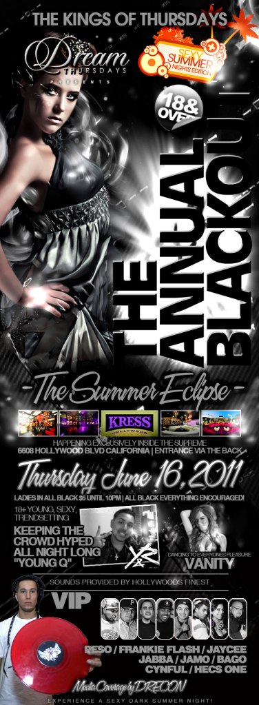 ……: DREAM Thursdays is Hollywoods Hottest Thursday dedicated to the upscale college crowd! Since its incepetion, nearly 600+ and now over 900+ at its residency inside KRESS makes it the absolute weekly party destination! It has achieved the status of “The KINGS of Thursday nights” due to the highly sophisticated crowd that it brings, and the enviornment in which its held. The fun & excitement never ends!!